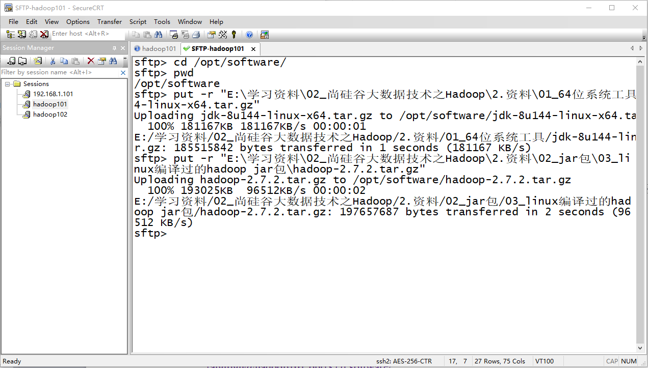 1、用SecureCRT工具将hadoop-2.7.2.tar.gz导入到opt目录下面的software文件夹下面