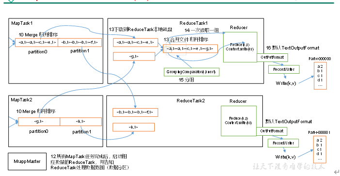 3)每个Reduce拉取Map端对应分区的数据。拉取数据后先存储到内存中,内存不够了,再存储到磁盘。拉取完所有数据后,采用归并排序将内存和磁盘中的数据都进行排序。在进入Reduce方法前,可以对数据进行分组操作。