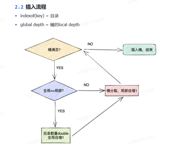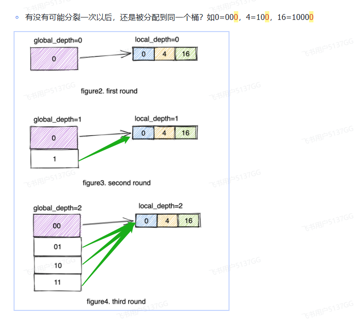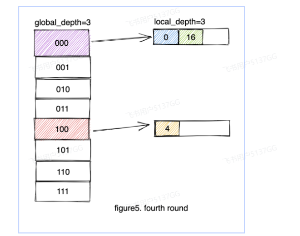 想一个问题, 图3->图4这种情况, 就是多个目录指针指向同一个桶, 一旦这个桶开始分裂, 那么我们要重新为多个目录项设定指向->循环解决
