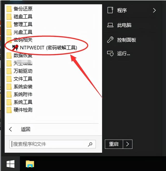 4、从U盘启动后,进入WinPE,点击“开始”菜单,点击“所有程序”选择“安装维护”,进入“Windows密码修改”模块。