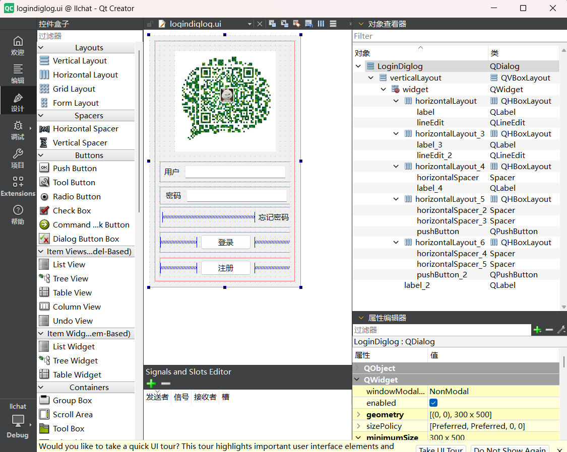 2)在属性编辑器里修改minimumSize的宽度为300,高度为500,maximumSize同理