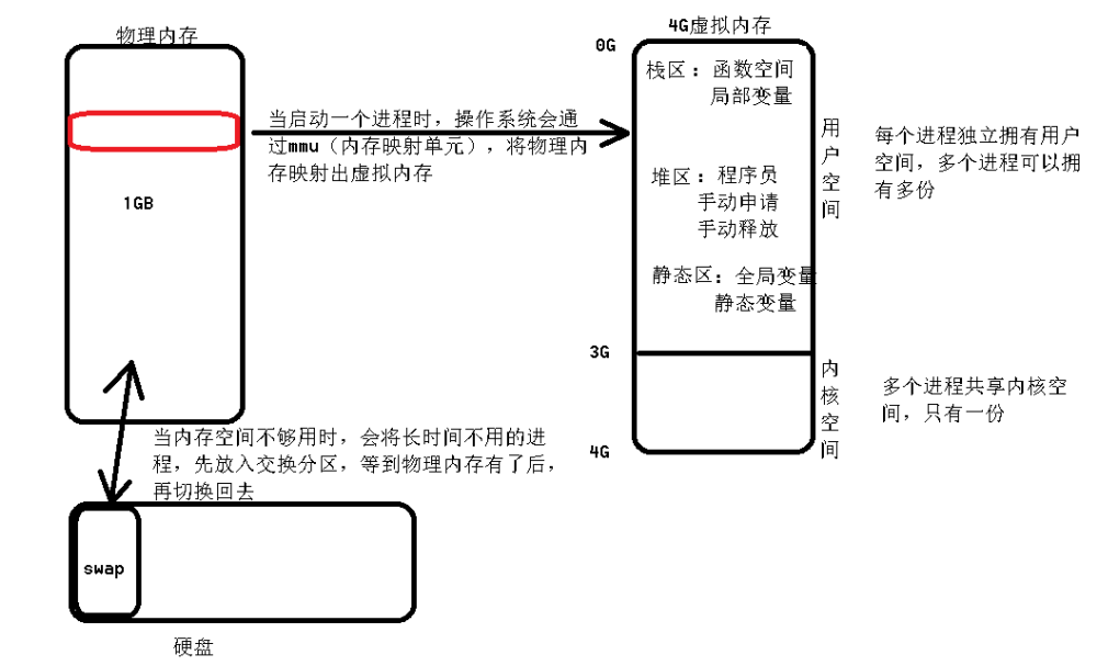- 每个进程分配0-4G虚拟内存,其中0-3G是用户空间,3-4G是内核空间
