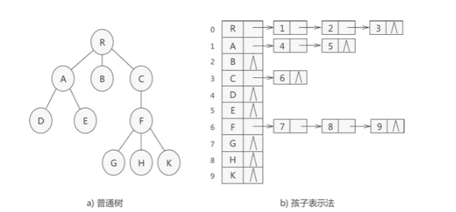 - 孩子表示法存储普通树采用的是顺序表+链表的组合结构。