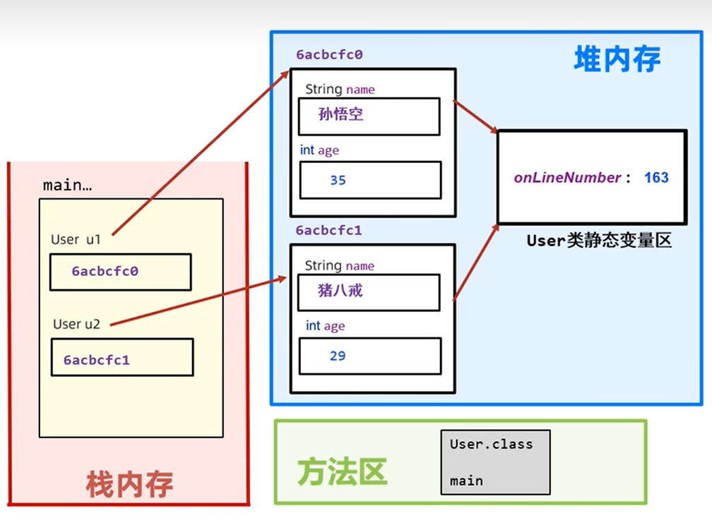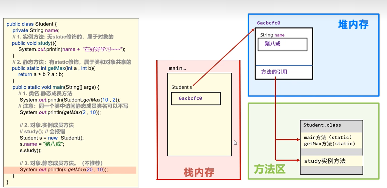 - 静态成员方法(无static修饰,归属于类),建议类名访问,也可以用对象访问