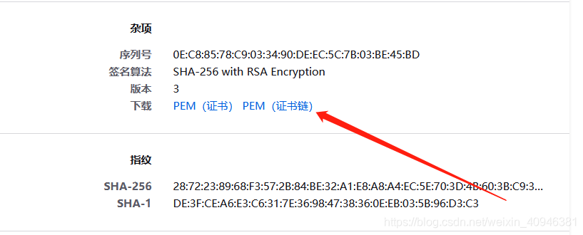 (3) 在第一个标签处往下翻,找到“PEM(证书链)”,点击下载后传到Linux。