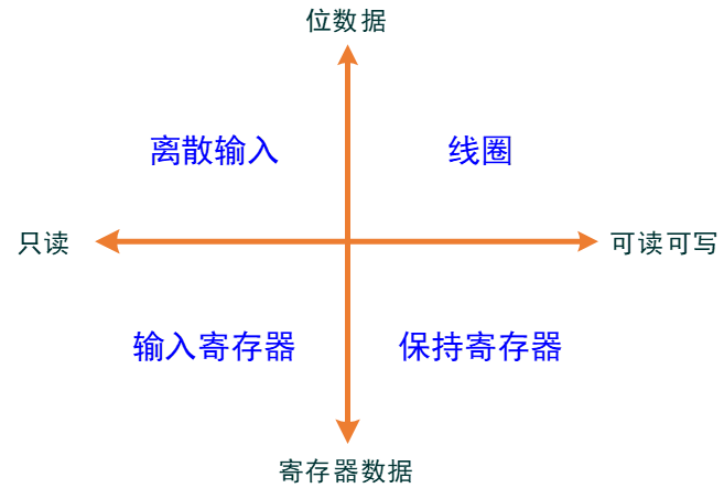 协议中定义4种数据块,基于数据类型可分为两类:BIT数据和寄存器数据,结合读写属性,数据块之间的关系如下图: