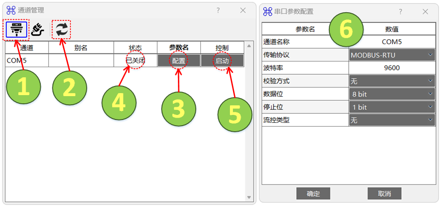 通过辅助菜单中的“通道”进入通道管理页面,查看当前PC中实际存在的串口列表。