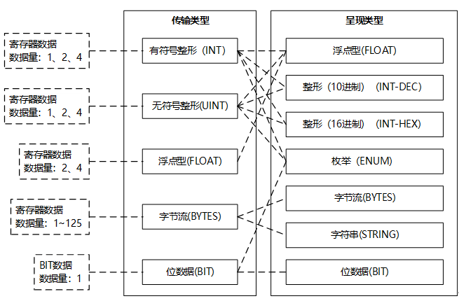 有符号整形(INT)、无符号整形(UINT)、浮点型(FLOAT)、字节流(BYTES)、位数据(BIT) |