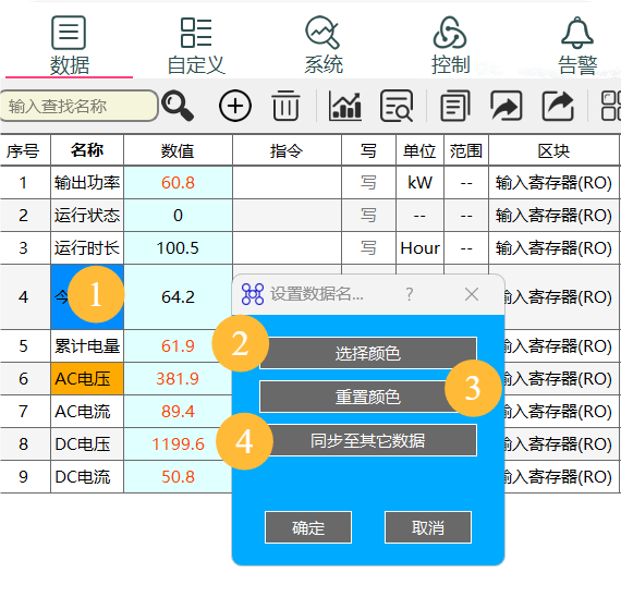 如需快速编辑数据配置的“名称”、“单位”、“地址”、“数量”、“位偏移”、“位数”、“系数”、“偏移”、“范围”,