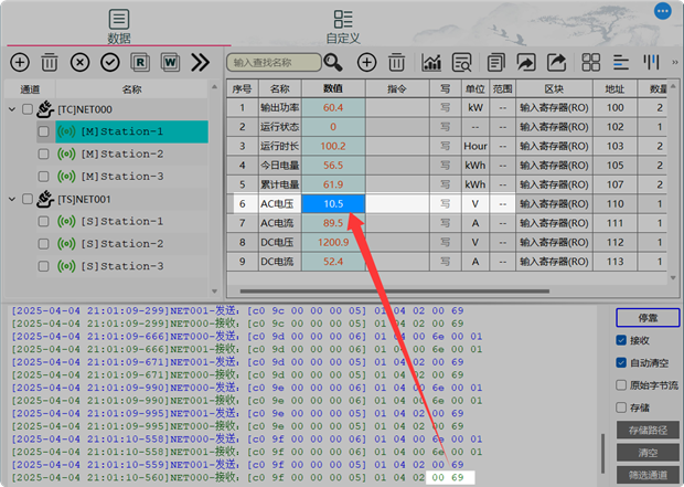 例如,从机上报电压数据10.5V,寄存器传输过程中数据则为0X0069,