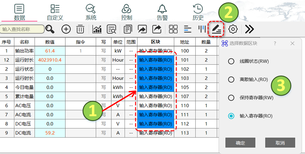双击单元格后选择修改数据区块类型,区块定义参考MODBUS标准协议,修改区块后,可能导致其他字段强制修改。 |