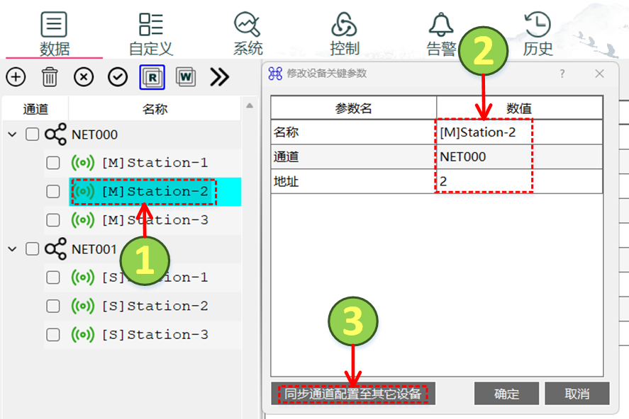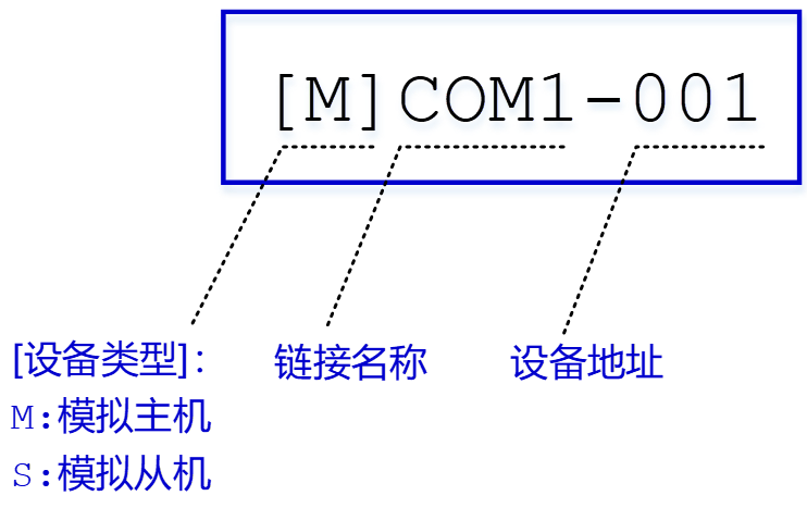 例如,设备原名称为:[M]COM1-001,如所属链接修改为COM2,地址修改为2,