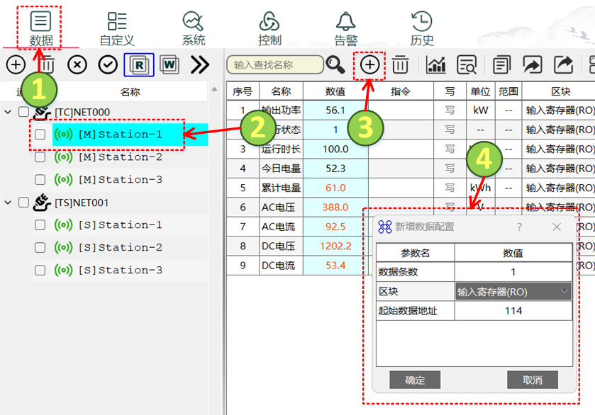 - 弹出“新增数据配置”页面,默认每次新增一条数据,起始数据地址为当前配置中最后一行数据地址+数据量。用户可修改新增的配置条数、区块和起始数据地址。