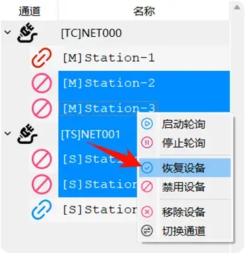 选择多个已被禁用的设备,右键点击任意选中设备,点击“恢复设备”。