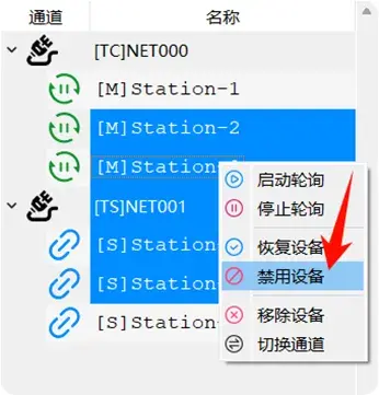 如需设备临时停止工作,可禁用设备,指示设备停止所有业务和通信。设备禁用操作常用于暂停模拟从机,可模拟设备掉线。