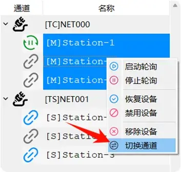 选择多个设备,右键点击任意选中设备,点击“切换通道”。