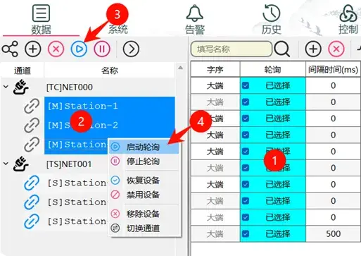 - 如需改变轮询的数据范围,重新勾选“轮询”的数据组合。设备“轮询”相关的参数变化后,需要重启轮询方可生效。