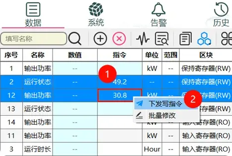 ❷选择待写入指令的数据行,右键菜单,点击“下发写指令”,立刻下发写数据指令。