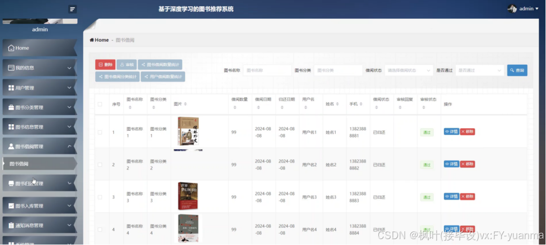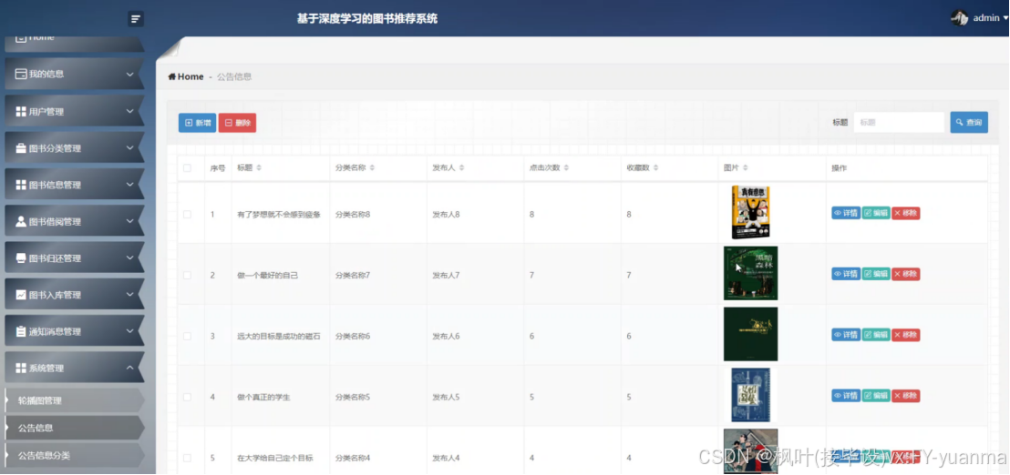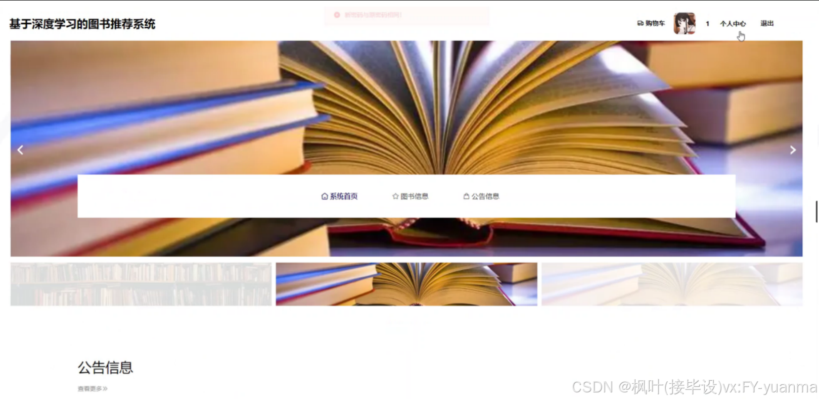 随着人工智能科技的飞速发展,深度学习在图书推荐系统中的应用日益广泛。本系统采用Java语言和Spring Boot框架进行编写,数据库使用MySQL数据库,结合深度学习算法,为用户提供个性化的图书推荐服务。环境通过分析用户的历史浏览、购买和收藏行为,构建用户画像,同时利用自然语言处理手艺分析图书内容,实现内容与用户需求的精准匹配。此外,环境还具备实时更新图书信息、智能分类和动态调整推荐策略的功能,以适应不断变化的用户偏好和市场趋势。通过深度学习模型的不断优化和迭代,本图书推荐平台旨在为用户给出更加丰富、多元和个性化的阅读体验,推动数字阅读服务的创新与发展。