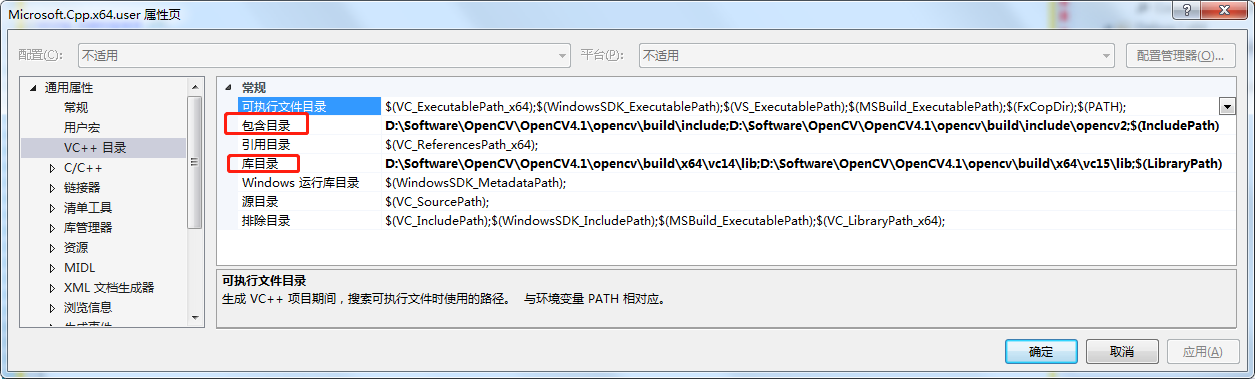 进入属性界面,编辑VC++目录中库目录和包含目录(注意:可能有的人点开Debug|x64没有Microsoft.Cpp.x64.user,那就添加添加现有属性表,我的文件路径是在C:\Users\Administrator\AppData\Local\Microsoft\MSBuild\v4.0\Microsoft.Cpp.x64.user.props,如果找不到的话就点击上一节点的Microsoft.Cpp.Win32.user查看属性,看在你电脑的什么位置,其实x86和x64的uesr都在一个文件夹下)