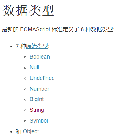 numberNaN/Infinity特殊string单引号/双引号/反引号``booleantrue/falsenullundefinedsymbol创建唯一值bigint