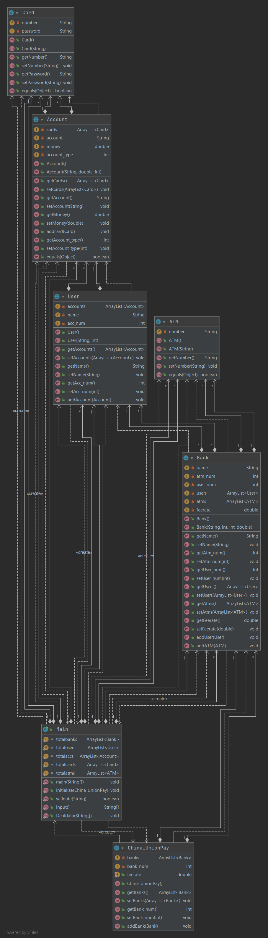 在题目8的基础上,程序实现了跨行取款的功能和增加透支卡的功能,实体类的关联关系直接使用题目8中的实体类的关联关系,不同的是需要修改账户类,来增加透支的功能;修改银行和银联类,来增加跨行取款和透支取款的利率;在计算时只需考虑到利息的情况即可,类之间的关联情况区别不大。
