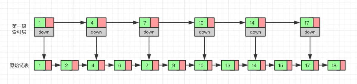 那我们有没有什么办法来提高查询的效率呢?我们可以为链表建立一个“索引”,这样查找起来就会更快,如下图所示,我们在原始链表的基础上,每两个结点提取一个结点建立索引,我们把抽取出来的结点叫做索引层或者索引,down 表示指向原始链表结点的指针。