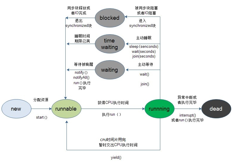(4)阻塞:运行状态过程中,可能有多个原因导致当前线程不继续运行下去,比如用户主动让线程睡眠(睡眠一定的时间之后再重新执行)、用户主动让线程等待,或者被同步块给阻塞,此时就对应着多个状态:time waiting(睡眠或等待一定的事件)、waiting(等待被唤醒)、blocked(阻塞)