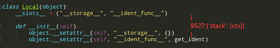 就是给我们这个Local类初始化了两个属性~~__storage__ = {} __ident_func__ = get_ident