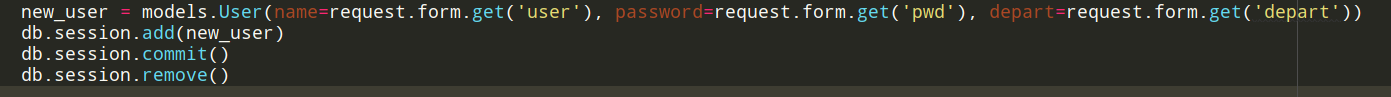 # 第一种:对于字段很多的对象,这种方式比较方便。 db.session.execute('insert into users(name, pwd, age) values(:user, :pwd, :age)', form.data) db.session.commit() db.session.remove() # 第二种: user = form.data['user'] pwd = form.data['pwd'] obj = models.Users(name=user, pwd=pwd) db.session.add(obj) db.session.commit() db.session.remove()