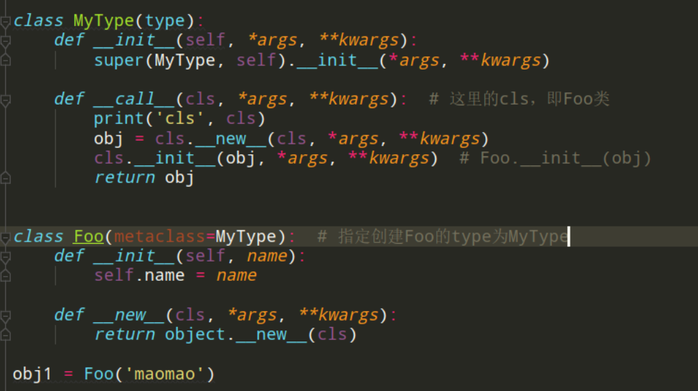 import threading class SingletonType(type): _instance_lock = threading.Lock() def __call__(cls, *args, **kwargs): if not hasattr(cls, "_instance"): with SingletonType._instance_lock: if not hasattr(cls, "_instance"): cls._instance = super(SingletonType,cls).__call__(*args, **kwargs) return cls._instance class Foo(metaclass=SingletonType): def __init__(self,name): self.name = name obj1 = Foo('name') obj2 = Foo('name') print(obj1,obj2)