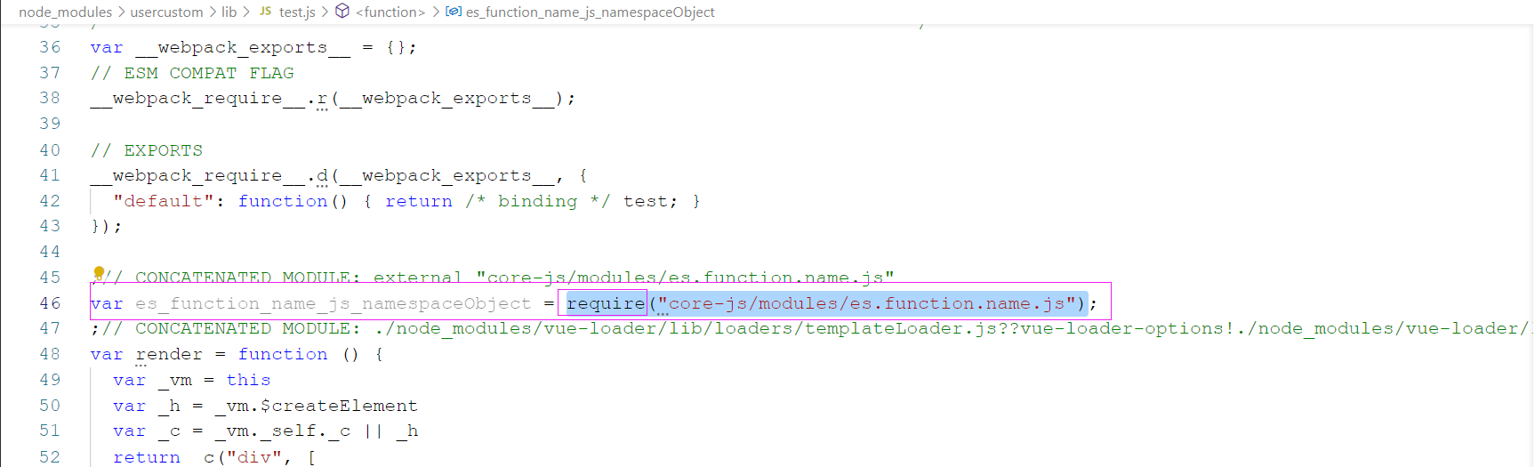 vue插件开发打包后,生成的文件中包含有require("core-js/modules/es.function.name.js"),