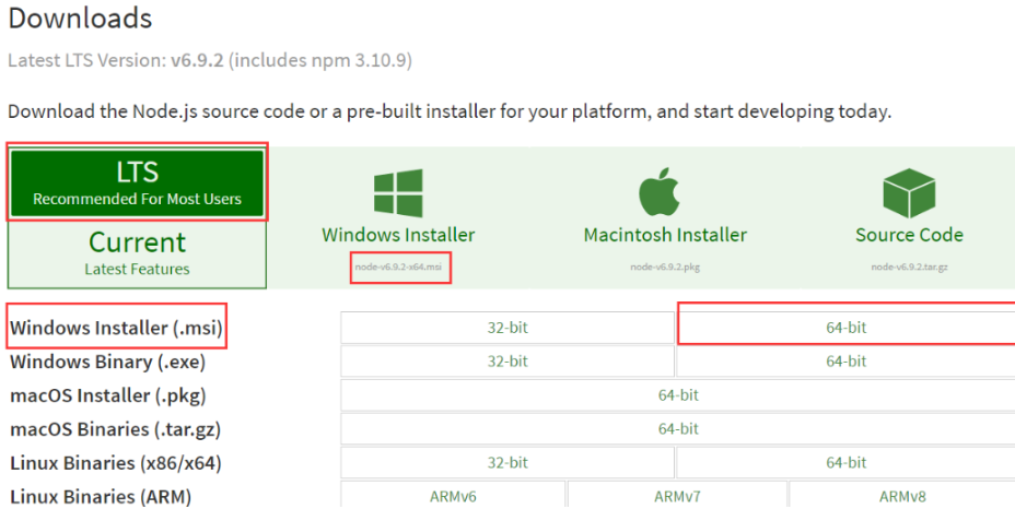 打开官网下载链接:https://nodejs.org/en/download/ 我这里下载的是node-v6.9.2-x64.msi,如下图: