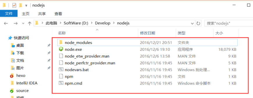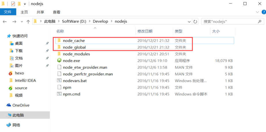 例如:我希望将全模块所在路径和缓存路径放在我node.js安装的文件夹中,则在我安装的文件夹【D:\Develop\nodejs】下创建两个文件夹【node_global】及【node_cache】如下图: