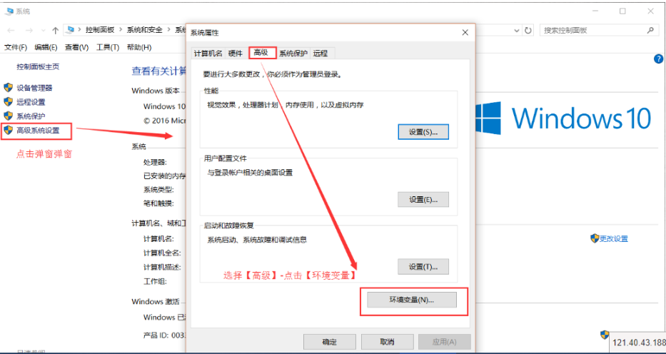 接下来设置环境变量,关闭cmd窗口,“我的电脑”-右键-“属性”-“高级系统设置”-“高级”-“环境变量”