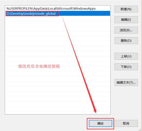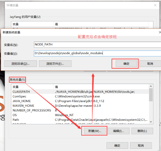 进入环境变量对话框,在【系统变量】下新建【NODE_PATH】,输入【D:\Develop\nodejs\node_global\node_modules】,将【用户变量】下的【Path】修改为【D:\Develop\nodejs\node_global】