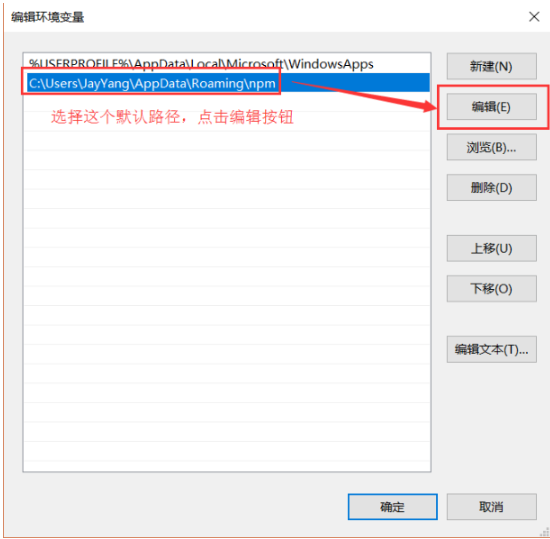 说明:这里的环境配置主要配置的是npm安装的全局模块所在的路径,以及缓存cache的路径,之所以要配置,是因为以后在执行类似:npm install express [-g] (后面的可选参数-g,g代表global全局安装的意思)的安装语句时,会将安装的模块安装到【C:\Users\用户名\AppData\Roaming\npm】路径中,占C盘空间。