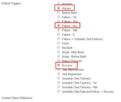 默认触发器设置,可以设置什么情况下发送构建信息,比如,目前选择的是:总是发送构建信息,只要失败就发送构建信息,成功发送构建信息