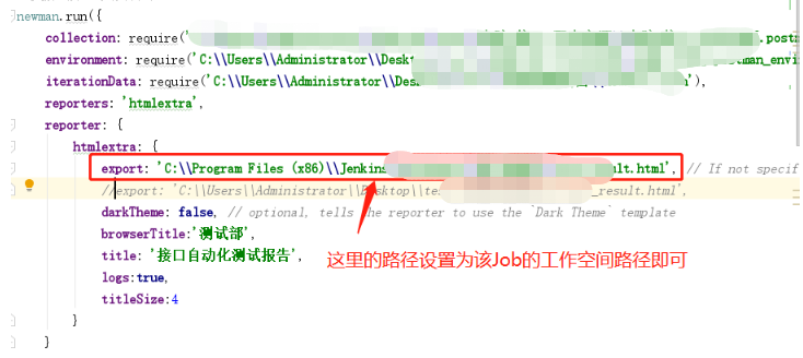 但是此处的初始默认地址为该Job的工作空间地址,因此,需要把测试报告生成在该目录中,才可以带入附件中。我们可以设置JS脚本中的export地址,如下图: