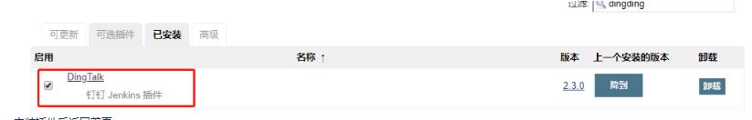 搜索插件(DingTalk)并安装,如果在Jenkins中无法搜索到该插件,则去该地址下载后手动上传至Jenkins即可:https://updates.jenkins.io/download/plugins/dingding-notifications/