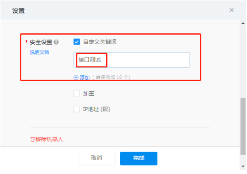 设置安全策略。这里选择设置关键字,此处设置的关键字一会儿需要和钉钉里设置的关键字相同,才能正常发送