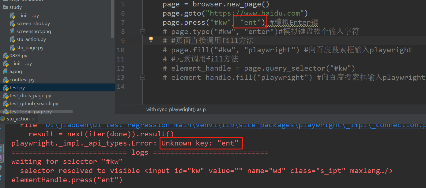 from playwright.sync_api import sync_playwright with sync_playwright() as p: browser = p.chromium.launch(headless=False,slow_mo=1000) page = browser.new_page() page.goto("https://www.baidu.com") #页面直接调用fill方法 page.fill("#kw", "playwright") #向百度搜索框输入playwright #元素调用fill方法 element_handle = page.query_selector("#kw") element_handle.fill("playwright") #向百度搜索框输入playwright