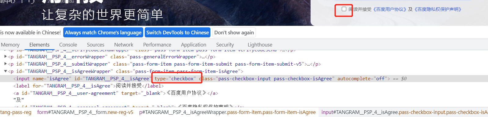 from playwright.sync_api import sync_playwright with sync_playwright() as p: browser = p.chromium.launch(headless=False,slow_mo=1000) context = browser.new_context() page = context.new_page() page.goto('https://passport.baidu.com/v2/?login') #进入百度的登录页面 with context.expect_page() as new_page_info: page.click("#TANGRAM__PSP_3__regLink")#点击我要注册 new_page = new_page_info.value new_page.check("#TANGRAM__PSP_4__isAgree") #选择同意协议
