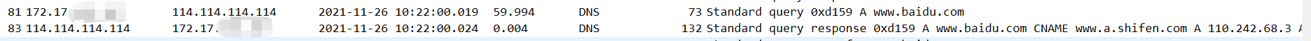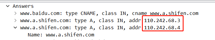 如图:通过wireshark抓包显示DNS数据,我们也可以看到dns是通过114.114.114.114这个地址进行解析的,而110.242.68.3/110.242.68.4才是百度对应的服务器
