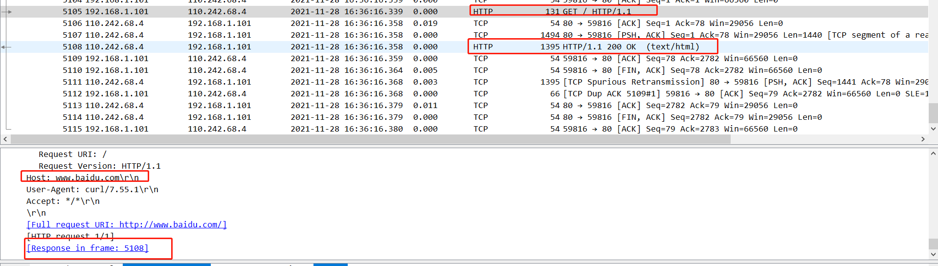 HTTP主要分为请求和响应两个部分,在wireshark中我们可以查看请求对应的响应信息。