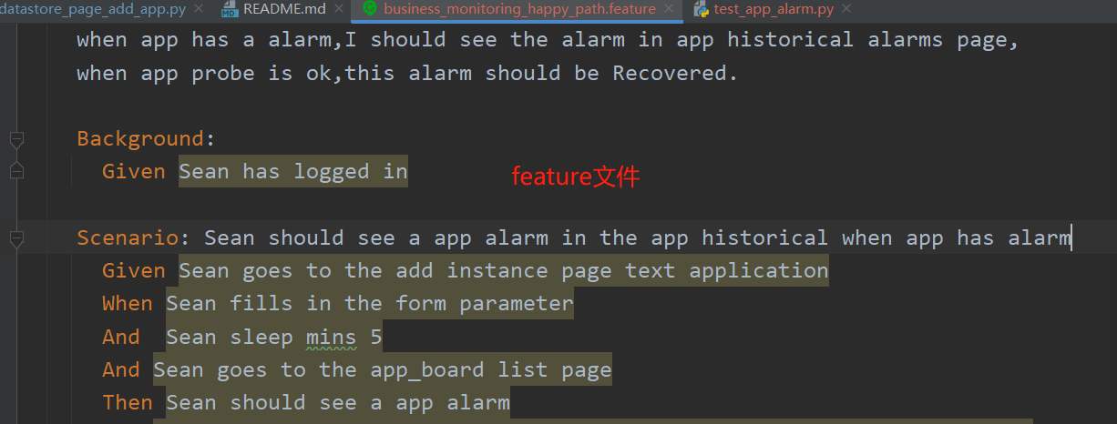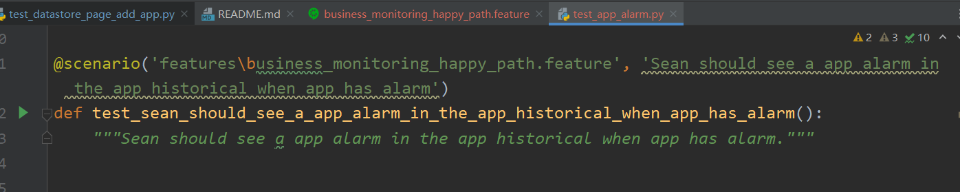 重新打开test_app_alarm.py文件就可以看到自动生成的步骤定义