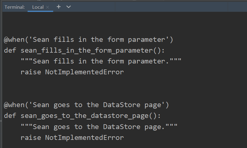 那么使用 pytest-bdd generate可以自动生成步骤定义(也就是方法名和装饰器,方法内的内容还需要自己书写)(如上图)