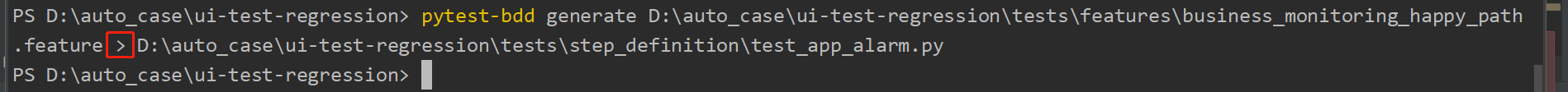 #在feature文件路径后增加>符号,可以直接加个生成的步骤定义写入到py文件中