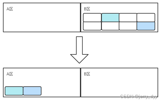 复制算法就是说有把内存划分为两块,A块和B块,第一次使用时比如说使用了B块,就会只在B块中分配对象,当进行垃圾回收的时候,把B块中存活的对象全部复制出来,然后放在A块里面,清空B块;垃圾回收之后,进行第二次使用时,使用A块,依次往复: