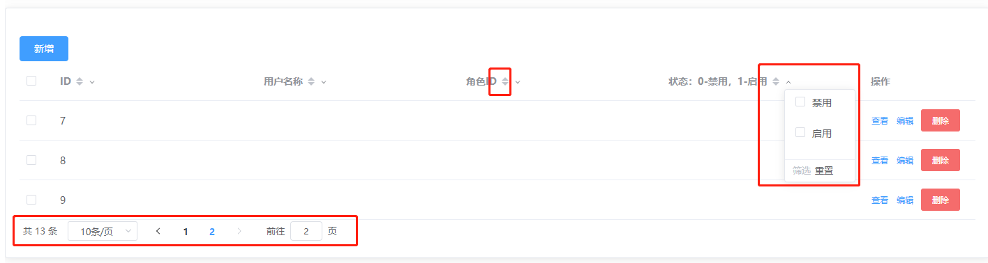 el-table和el-pagination所有特性基本上都可以使用,红色圈内是新增的,其他还有什么尽管绑定即可,另外冲突的disabled需要分开